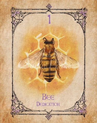 Within the Ogham tree landscape, Bee belongs wherever flowering meets fruiting — particularly among Apple, Hawthorn, and Blackthorn, where blossom opens briefly before returning inward. She reminds us that sweetness is earned through attention, that community is sustained through shared effort, and that belonging is shaped through contribution.