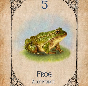 Frog represents the divine feminine, the rivers the lakes and the full moon. Just as the princess kissed the frog, show compassion to life’s difficulties and ask frog to step up and do their thing to make the world a brighter place.